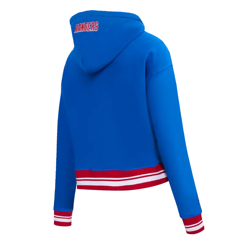 NHL NEW YORK RANGERS SCRIPT TAIL WOMEN’S RIB FLEECE CROPPED PULLOVER HOODIE (ROYAL BLUE\/RED)